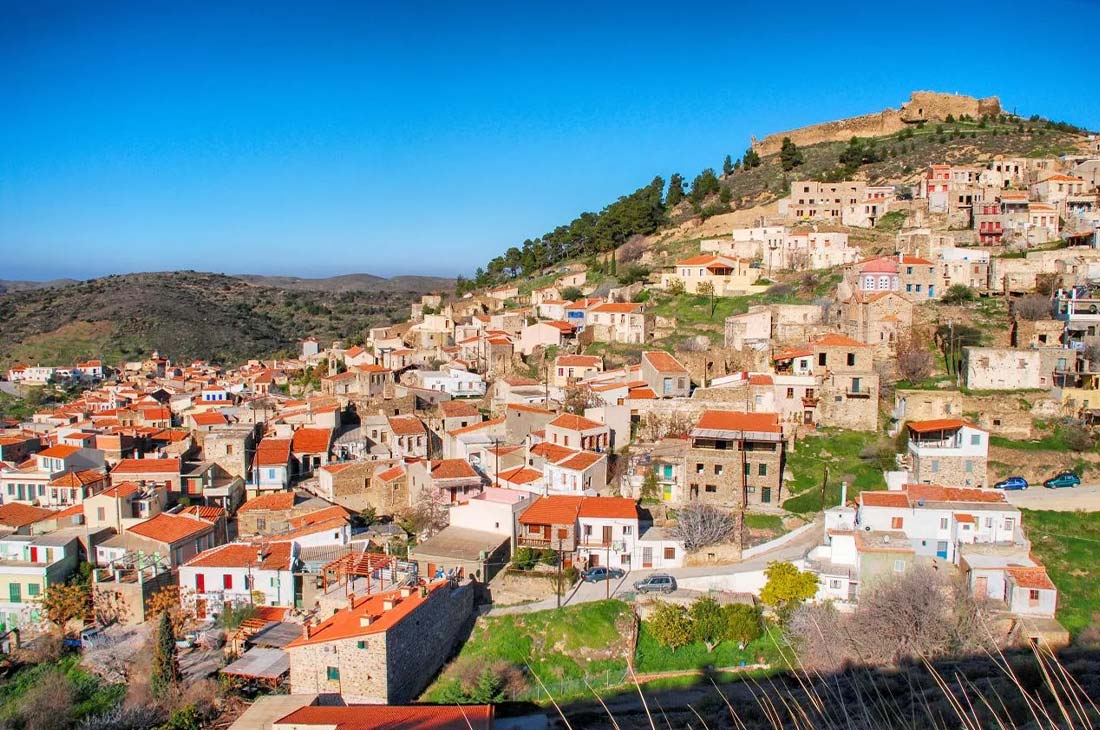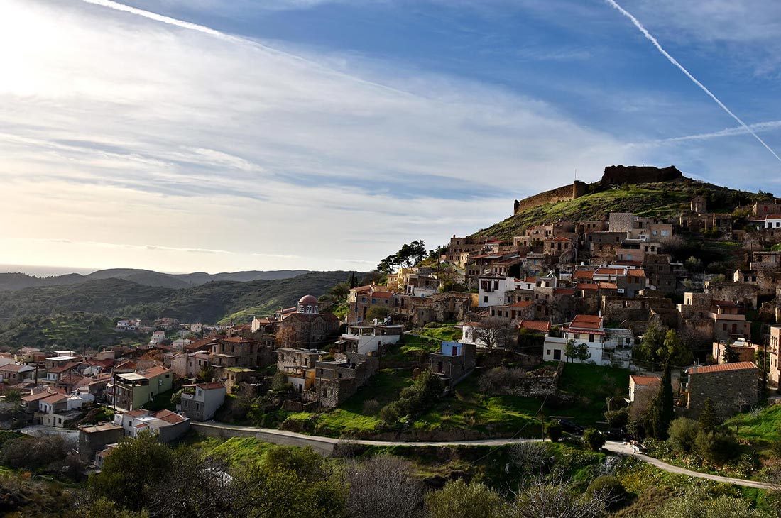 During the Byzantine period, it was a strong protective fortress that prevented the raids of the Turks and pirates. You can see some of the circular towers that are located in the outer corners of the village. The small alleys with cobblestone streets and the stone-built houses with arches offer the visitor a unique experience. It is worth trying the souma, a locally produced Mesta wine, and celebrating it with song and dance. The square is ideal for the visitor to enjoy their coffee, while the port of Mesta, 4 kilometers from the village, is considered an essential destination for fresh fish and ouzo.