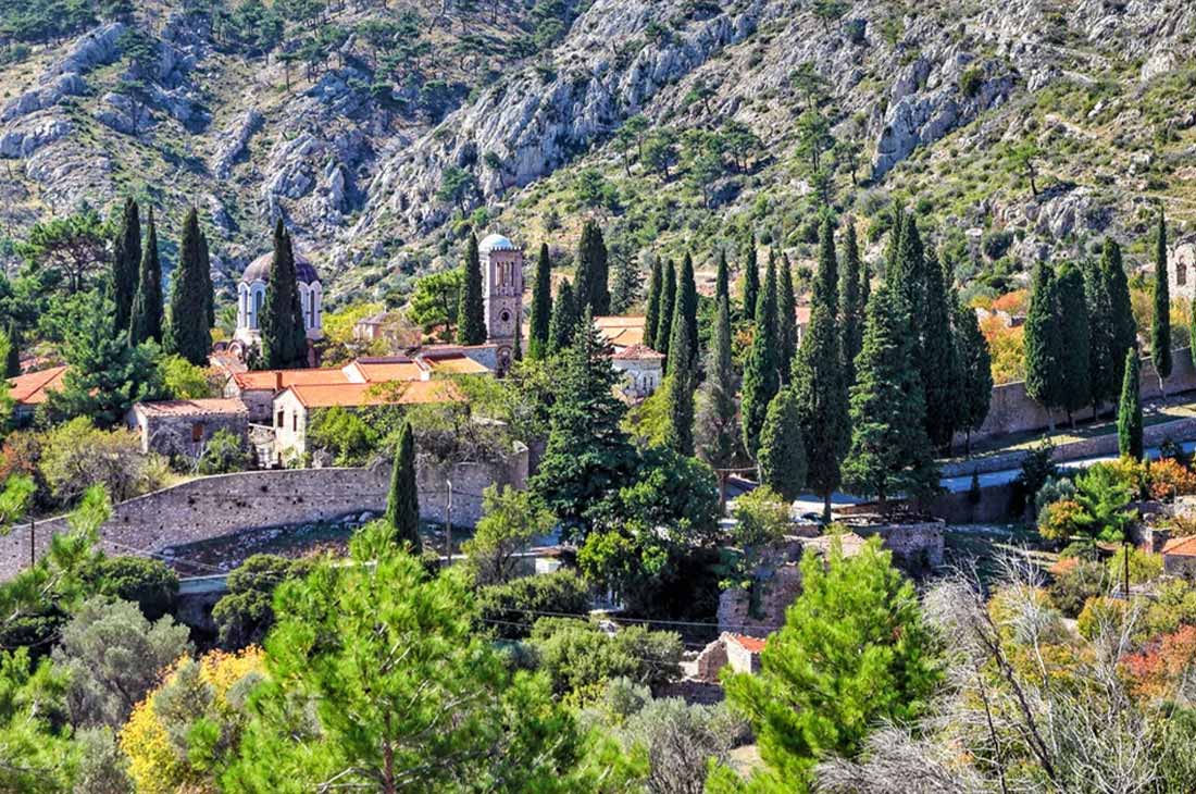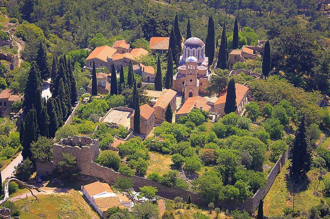 One should not miss the opportunity to admire the unique architectural layout of the temple up close with the elaborate well-preserved mosaics inside for which it is famous. The ossuary from the Chios massacre is characteristic, which will cause you to shiver and move. A historical monument of significant religious value that is worth visiting in a wooded area with a spectacular view that will impress you.